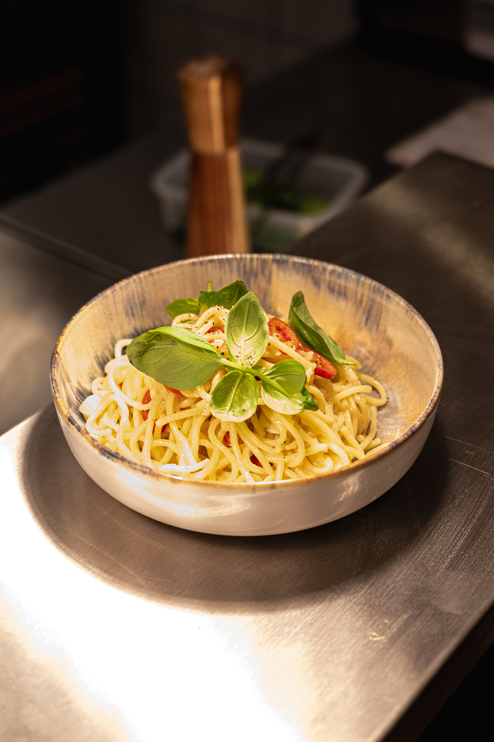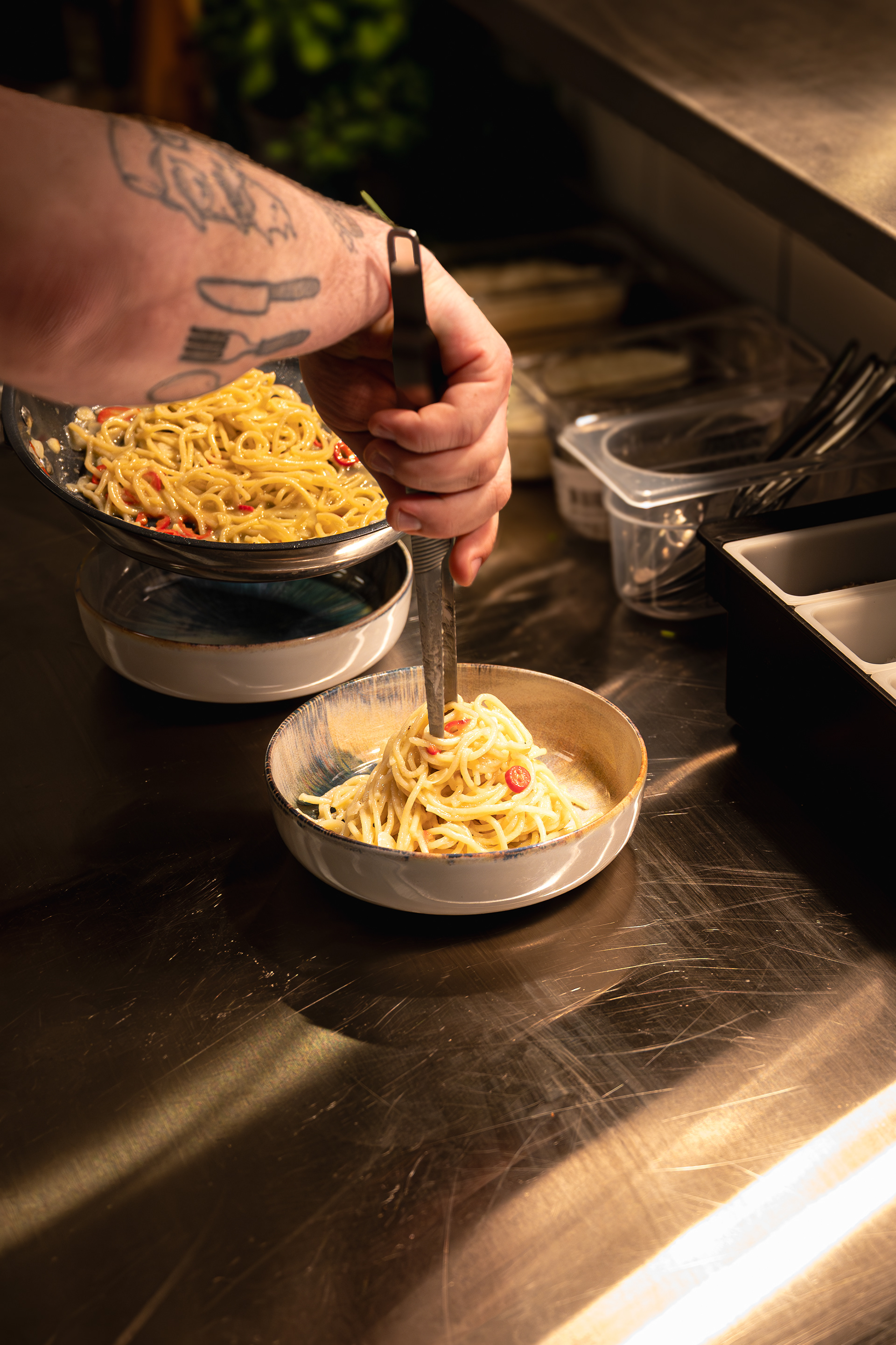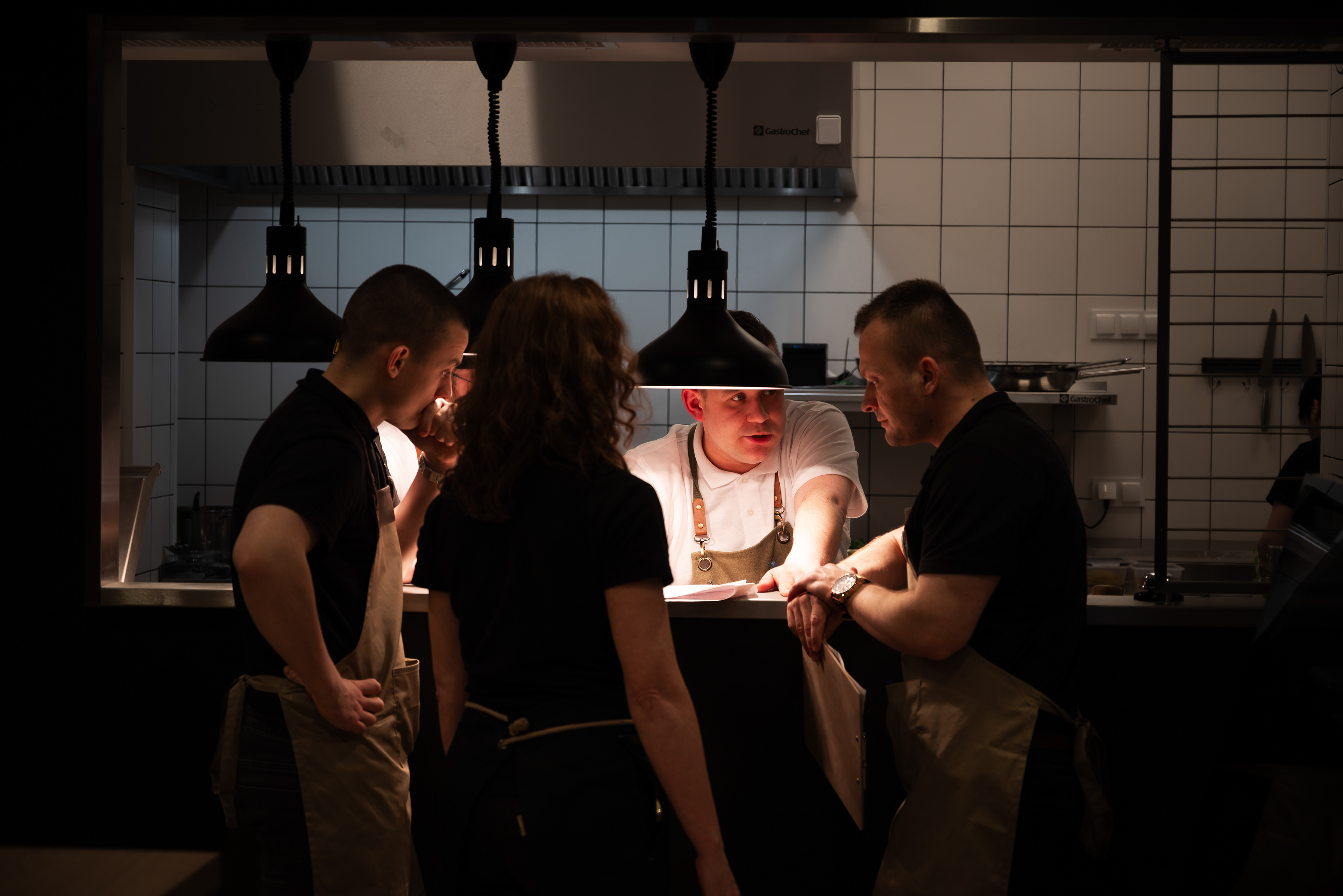 Jest ruch, zmienne światło, tempo pracy kuchni, ludzie wokół.