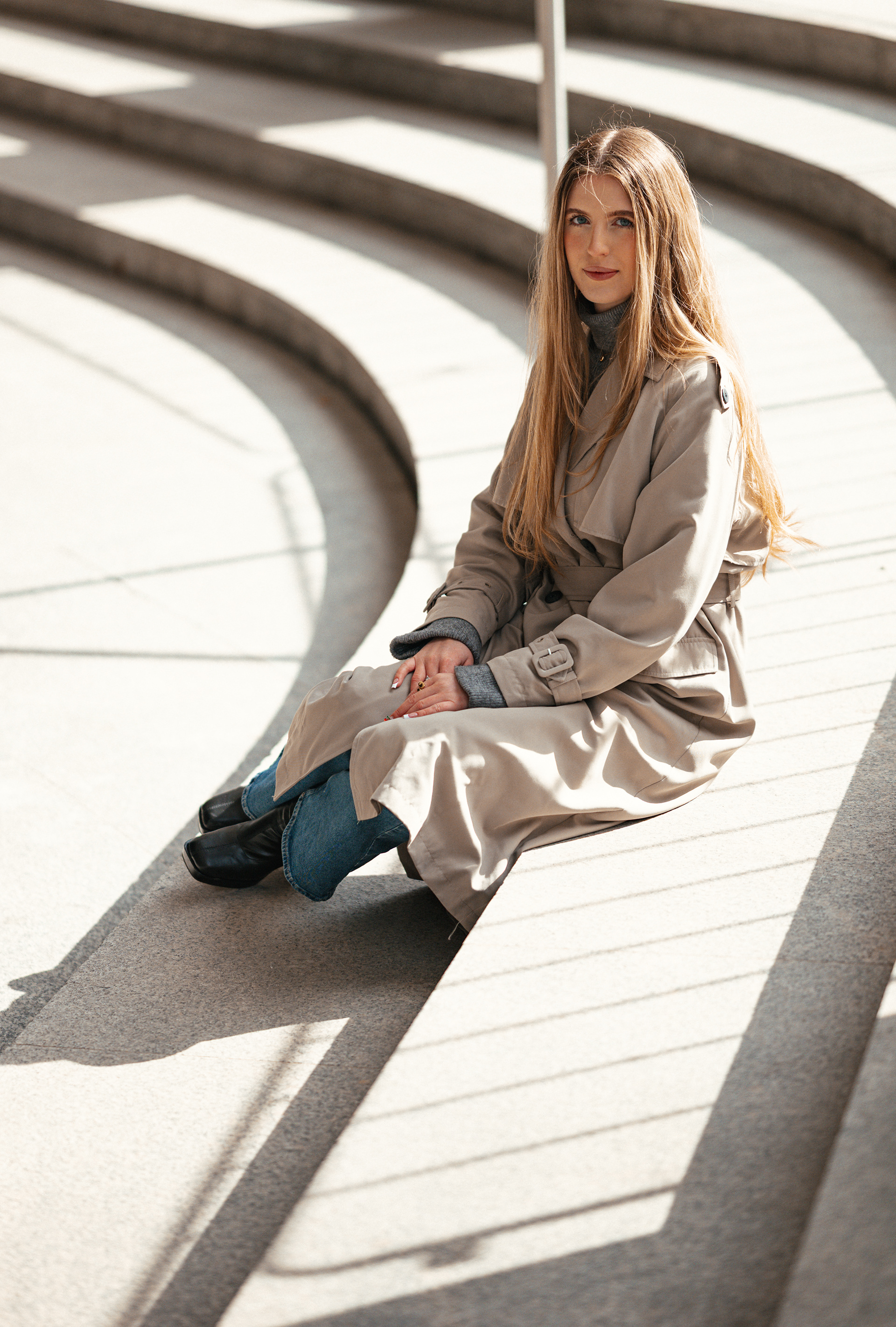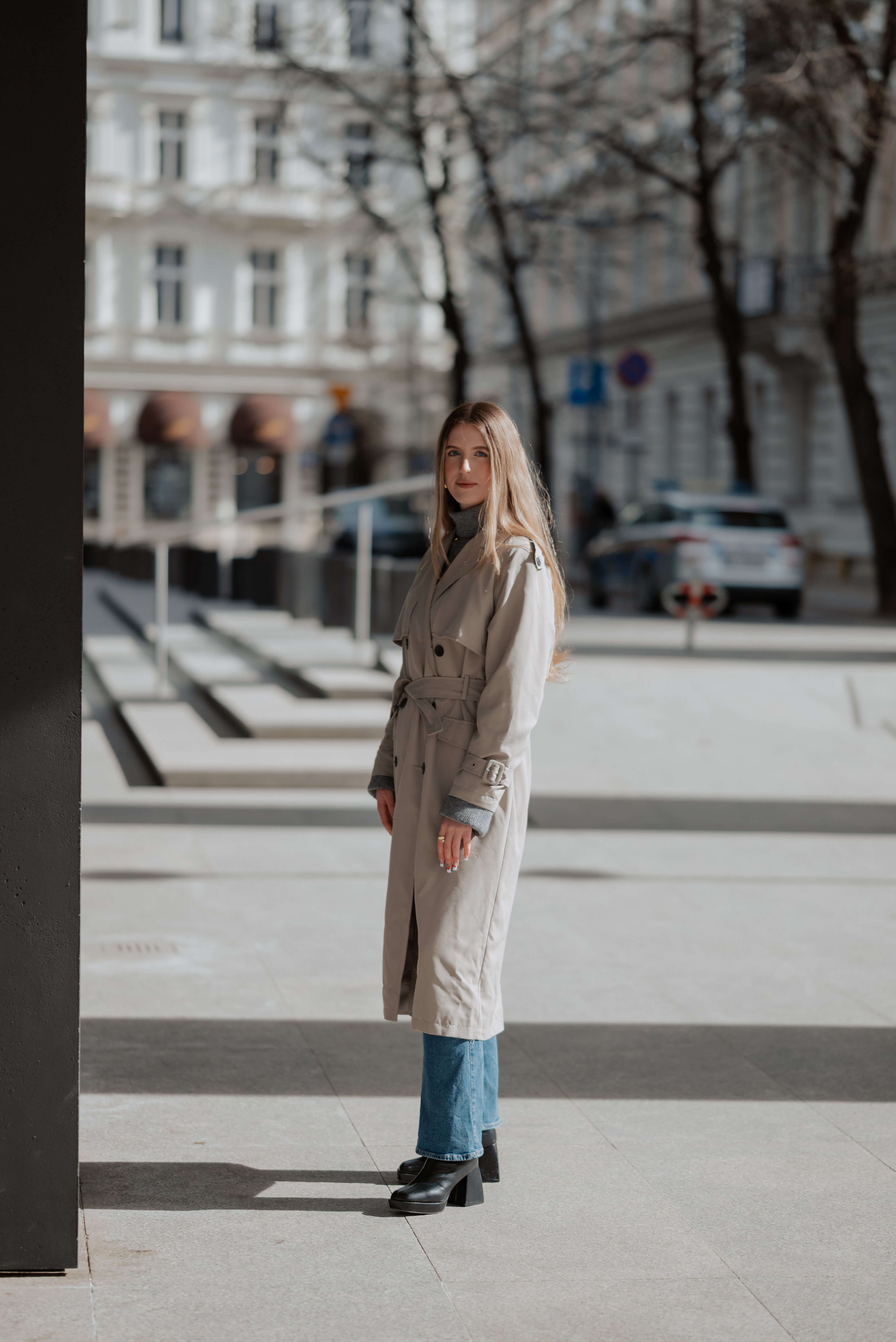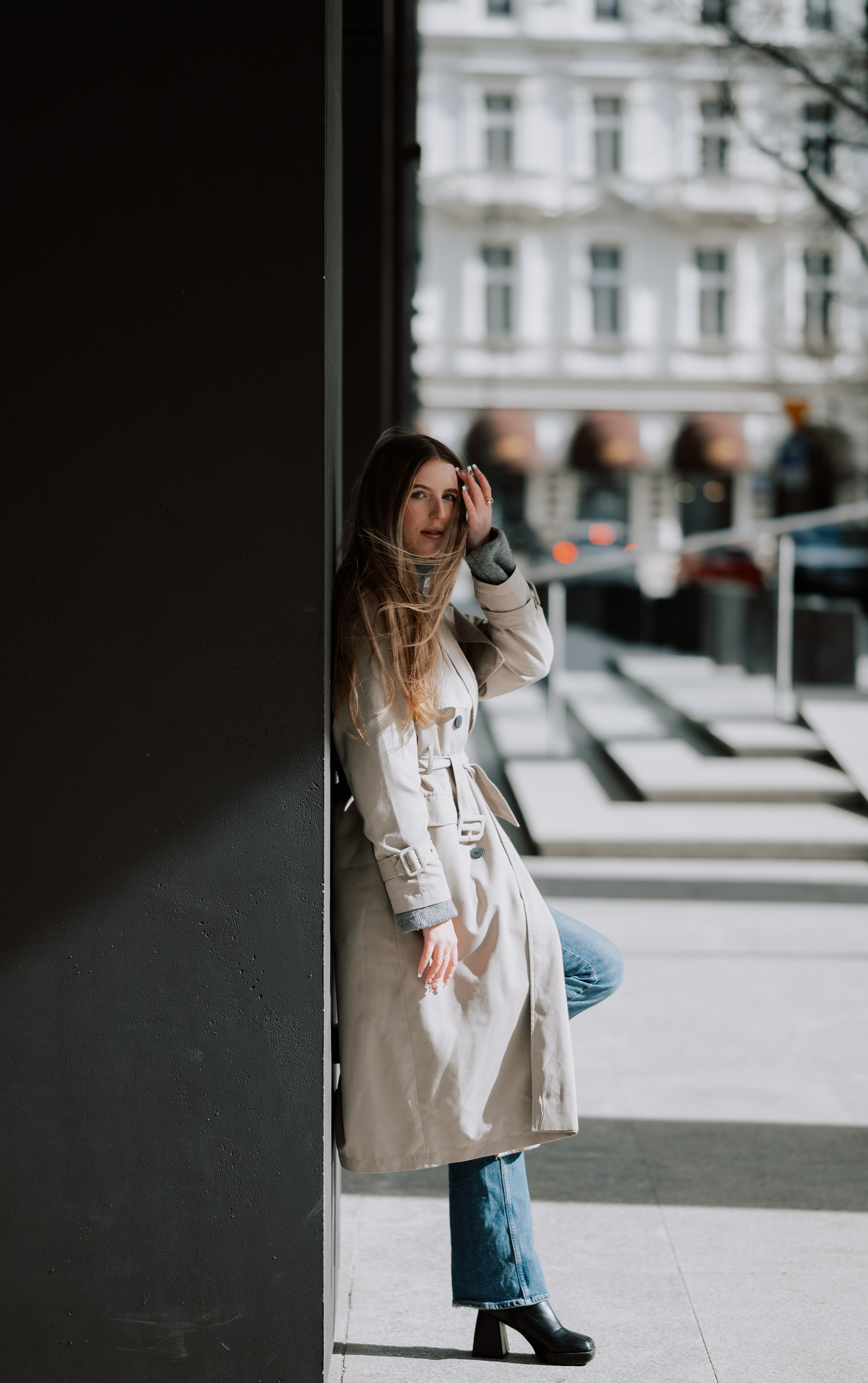 Spotkałyśmy się w centrum Warszawy. Było chłodno, ale słońce grało pierwsze skrzypce – odbijało się od betonu, tworzyło geometryczne cienie i malowało Monikę światłem. Takie światło kocham najbardziej.