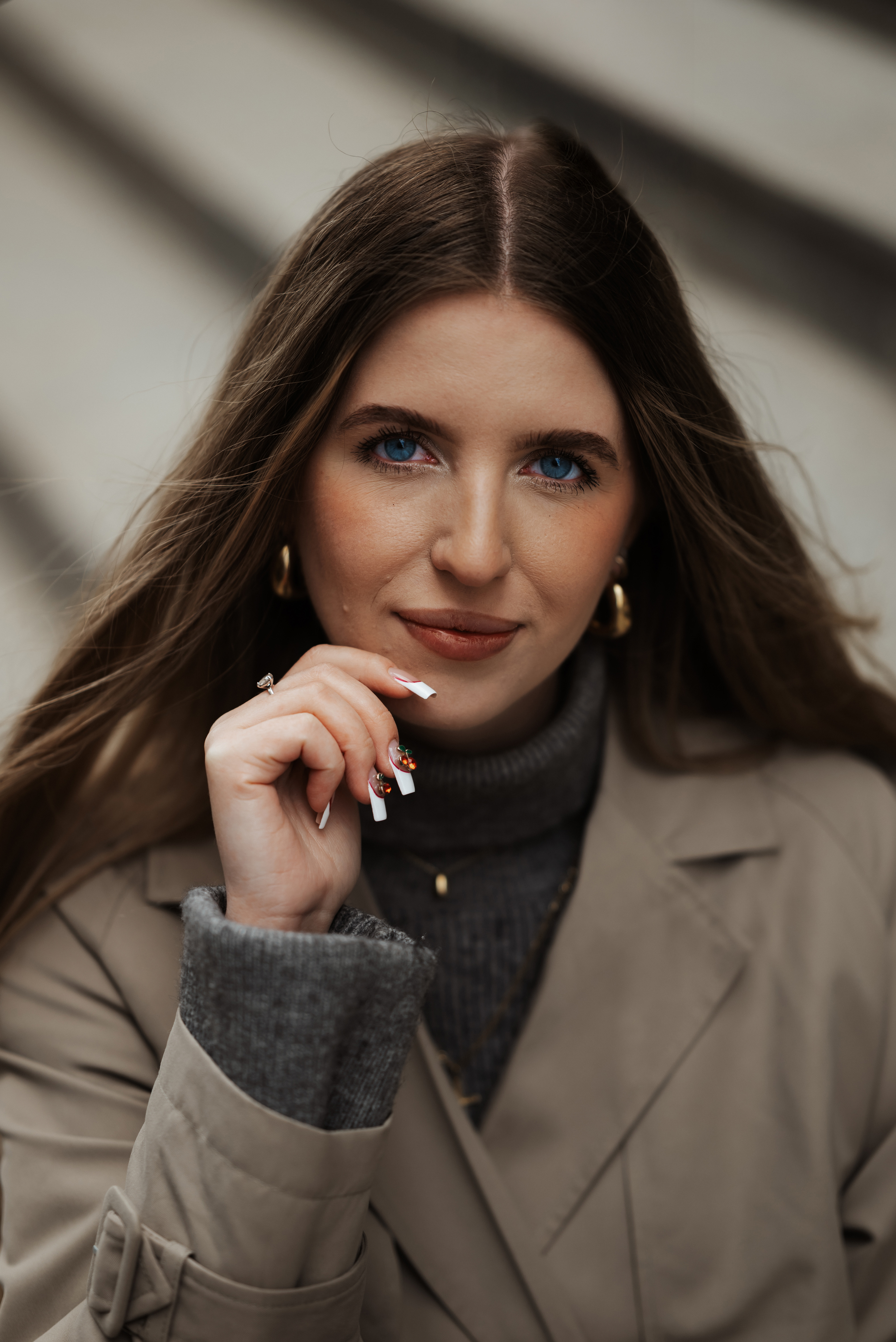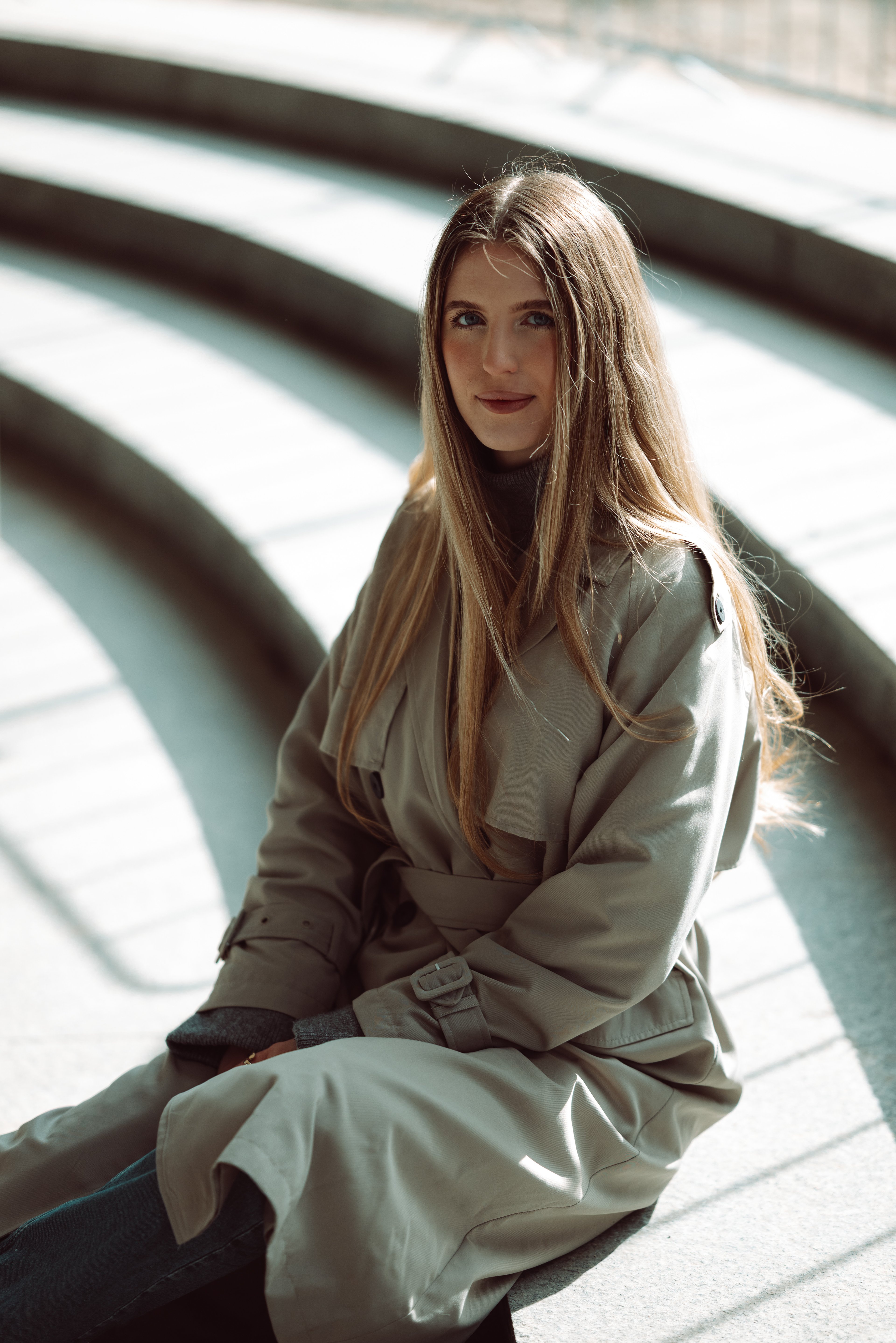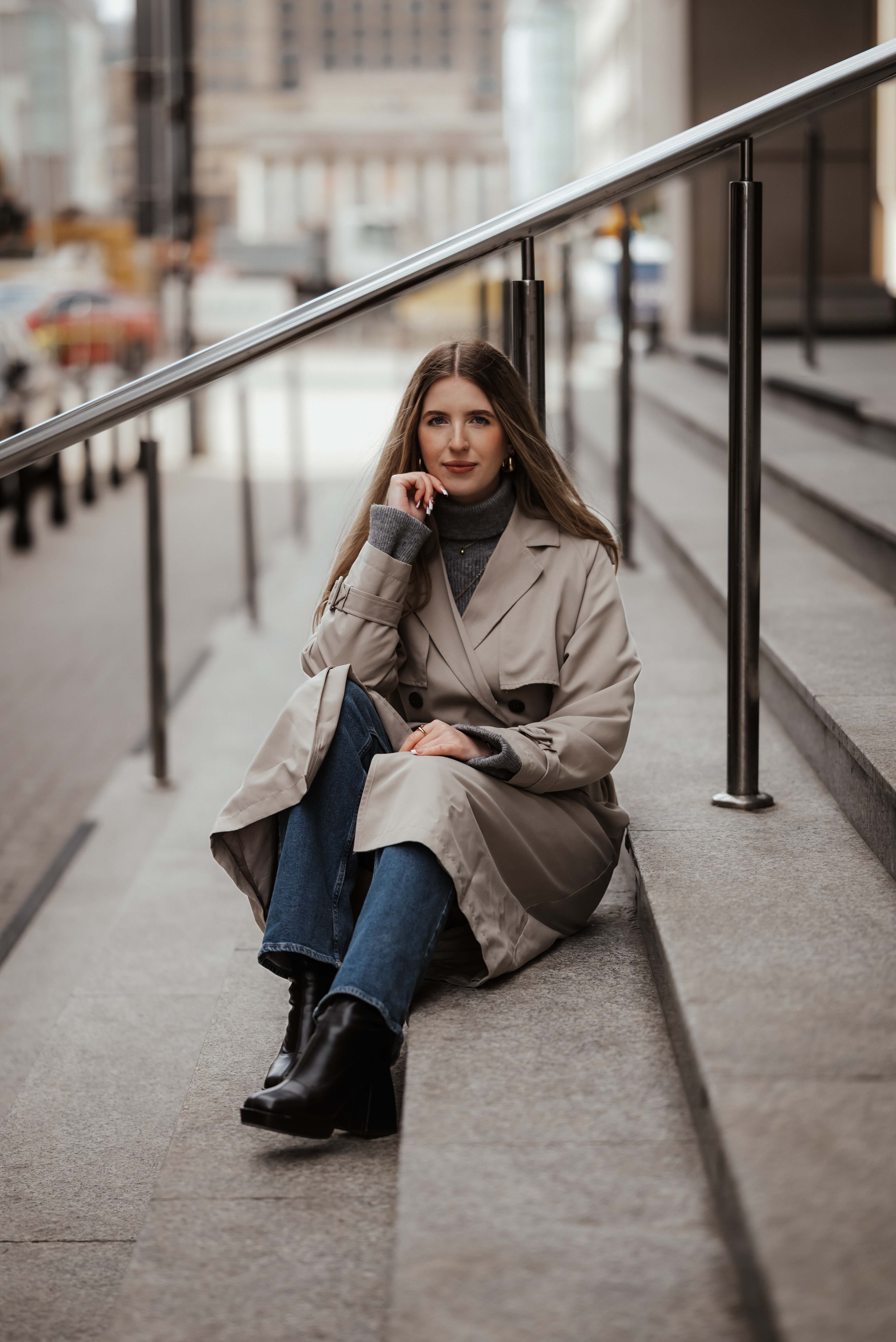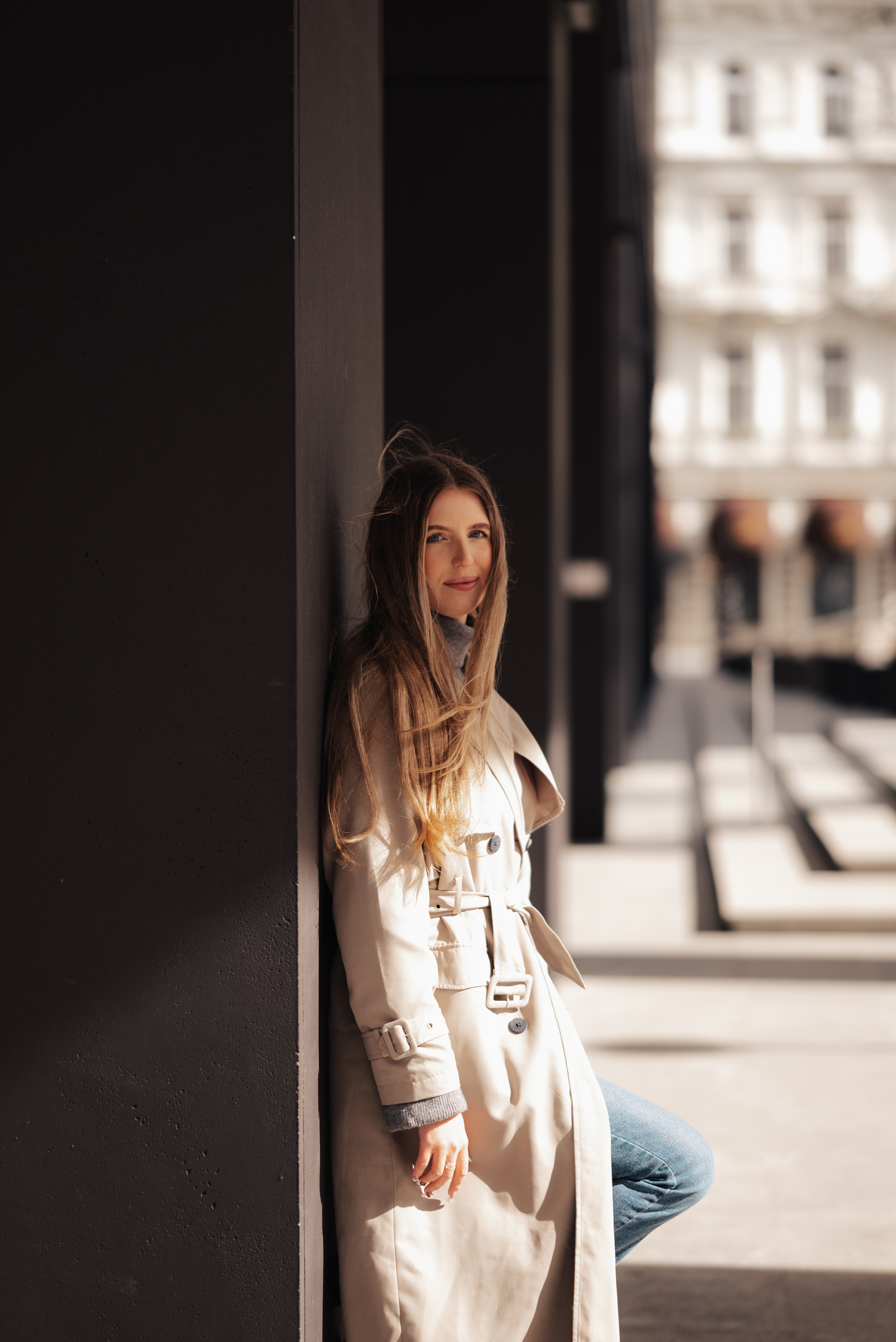 Spotkałyśmy się w centrum Warszawy. Było chłodno, ale słońce grało pierwsze skrzypce – odbijało się od betonu, tworzyło geometryczne cienie i malowało Monikę światłem. Takie światło kocham najbardziej.