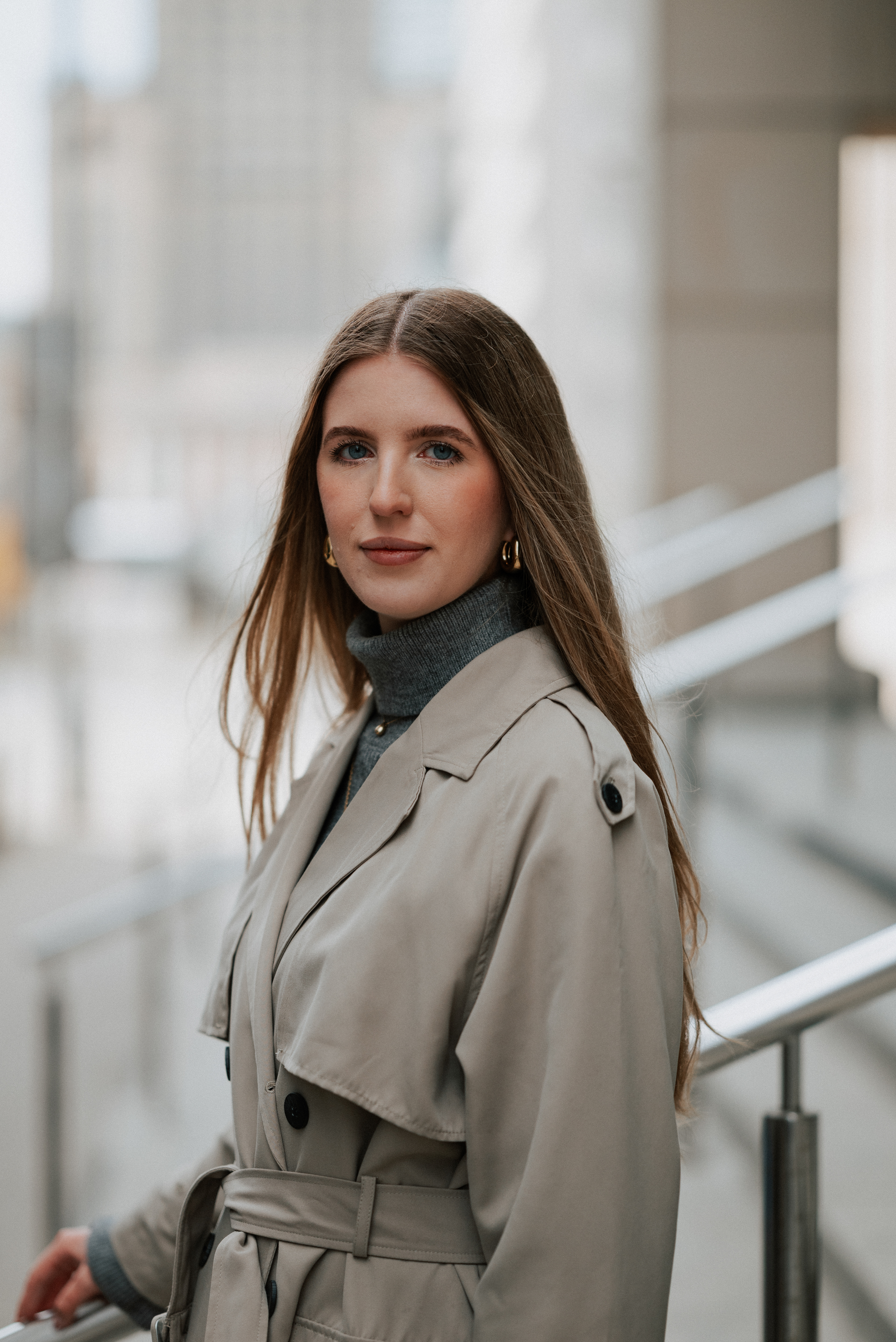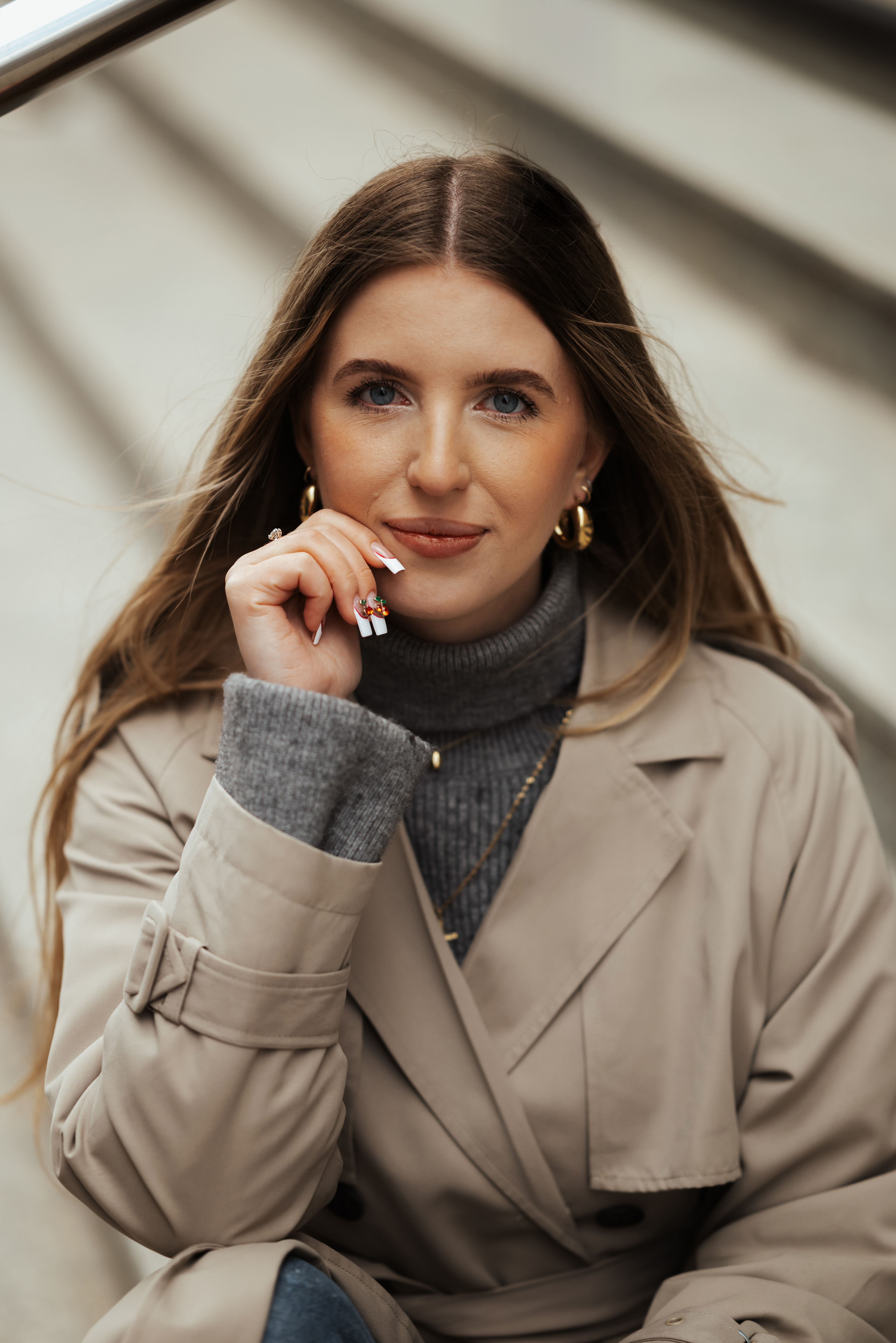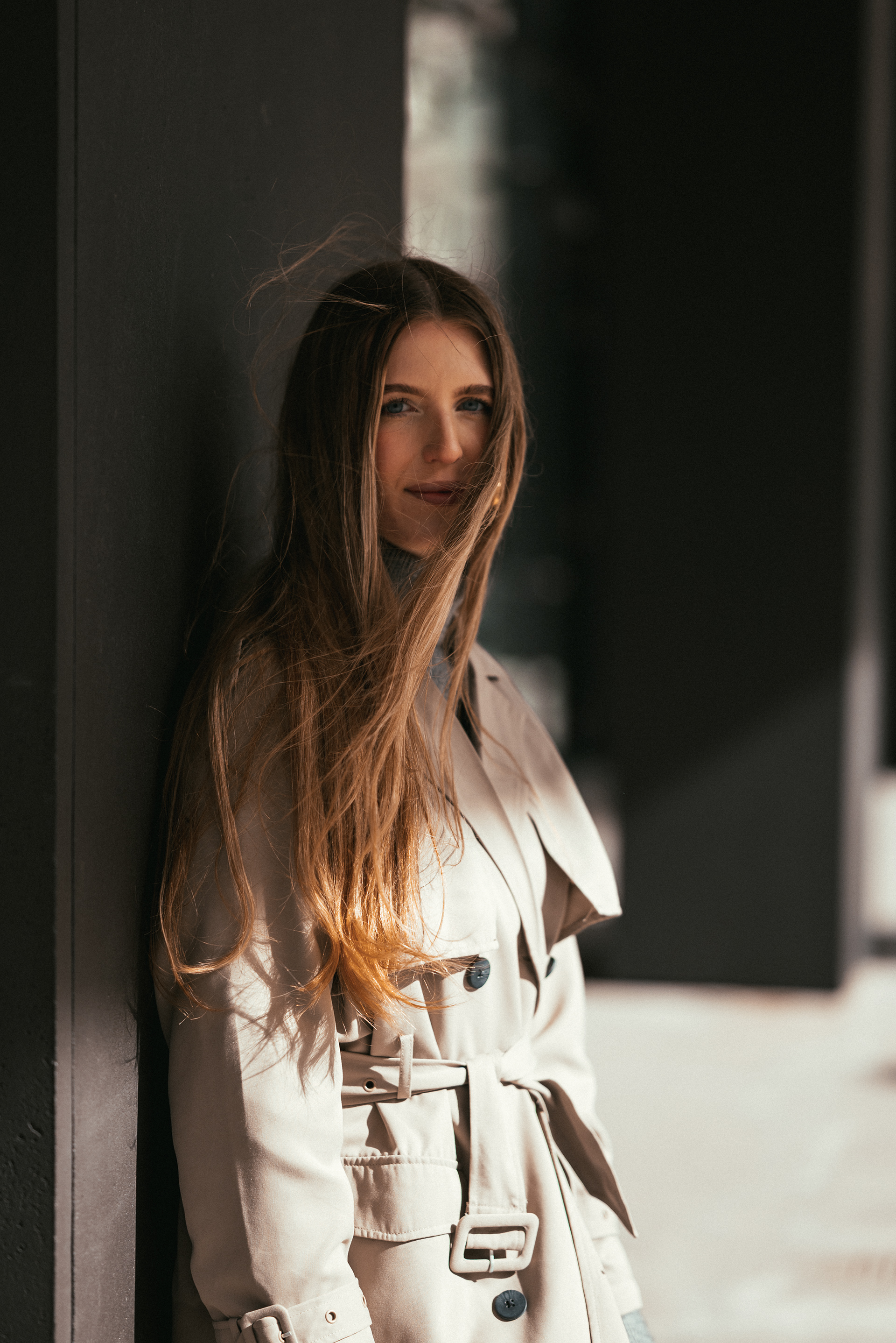 Monika ma w sobie spokój. Delikatność, która nie potrzebuje wielu słów. Wystarczyła chwila, byśmy złapały wspólny rytm. Zatrzymywałyśmy się tam, gdzie światło najpiękniej rysowało linię wokół niej – na schodach, w przejściu, przy barierkach.