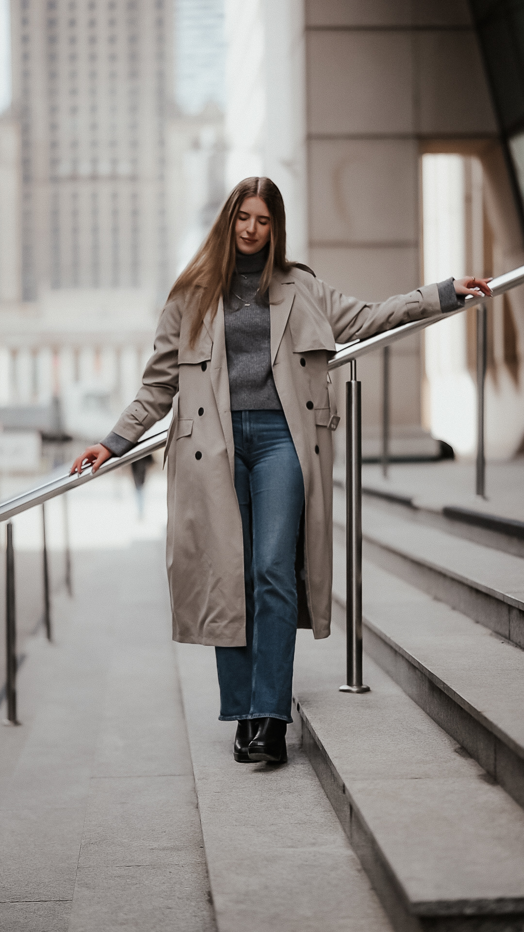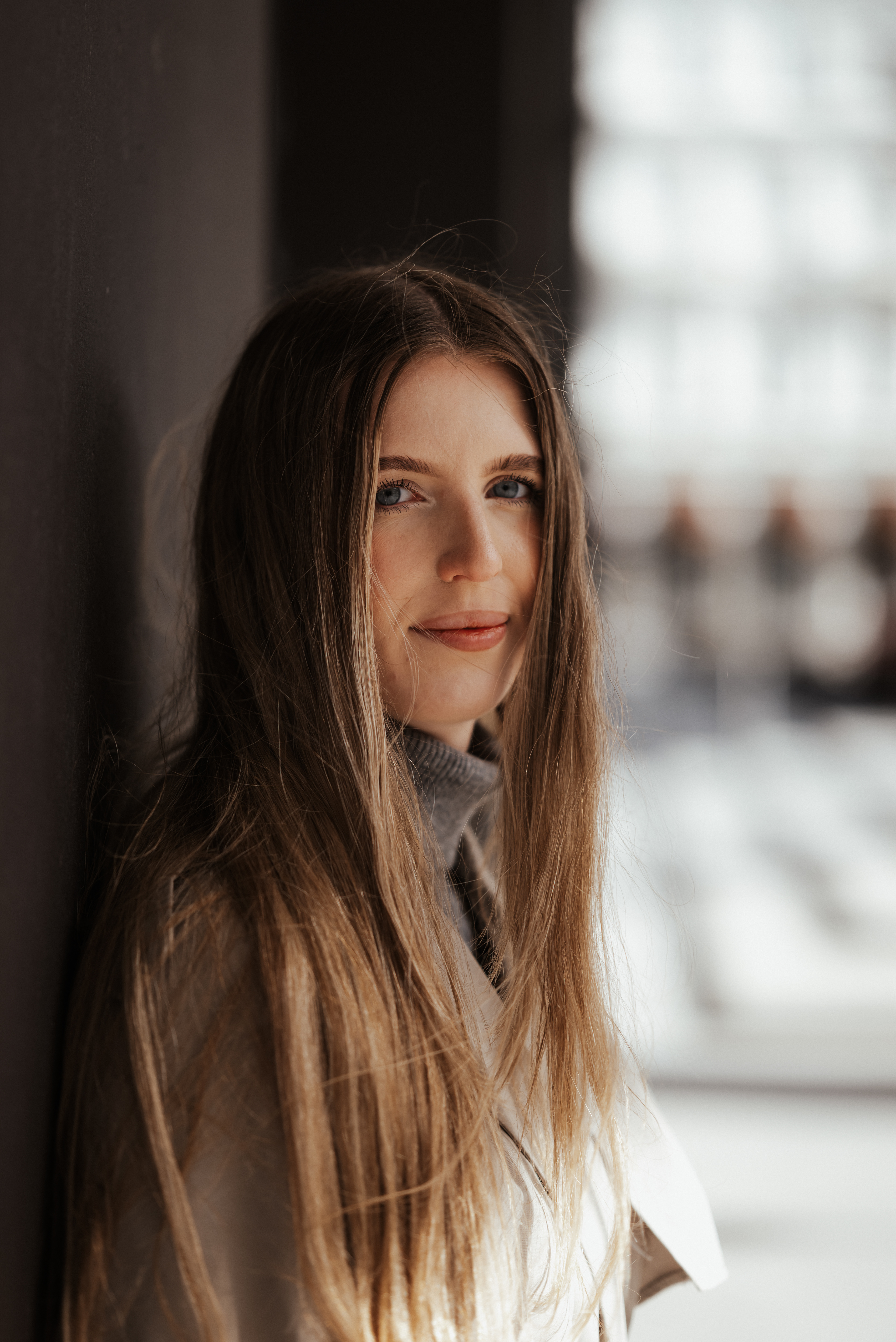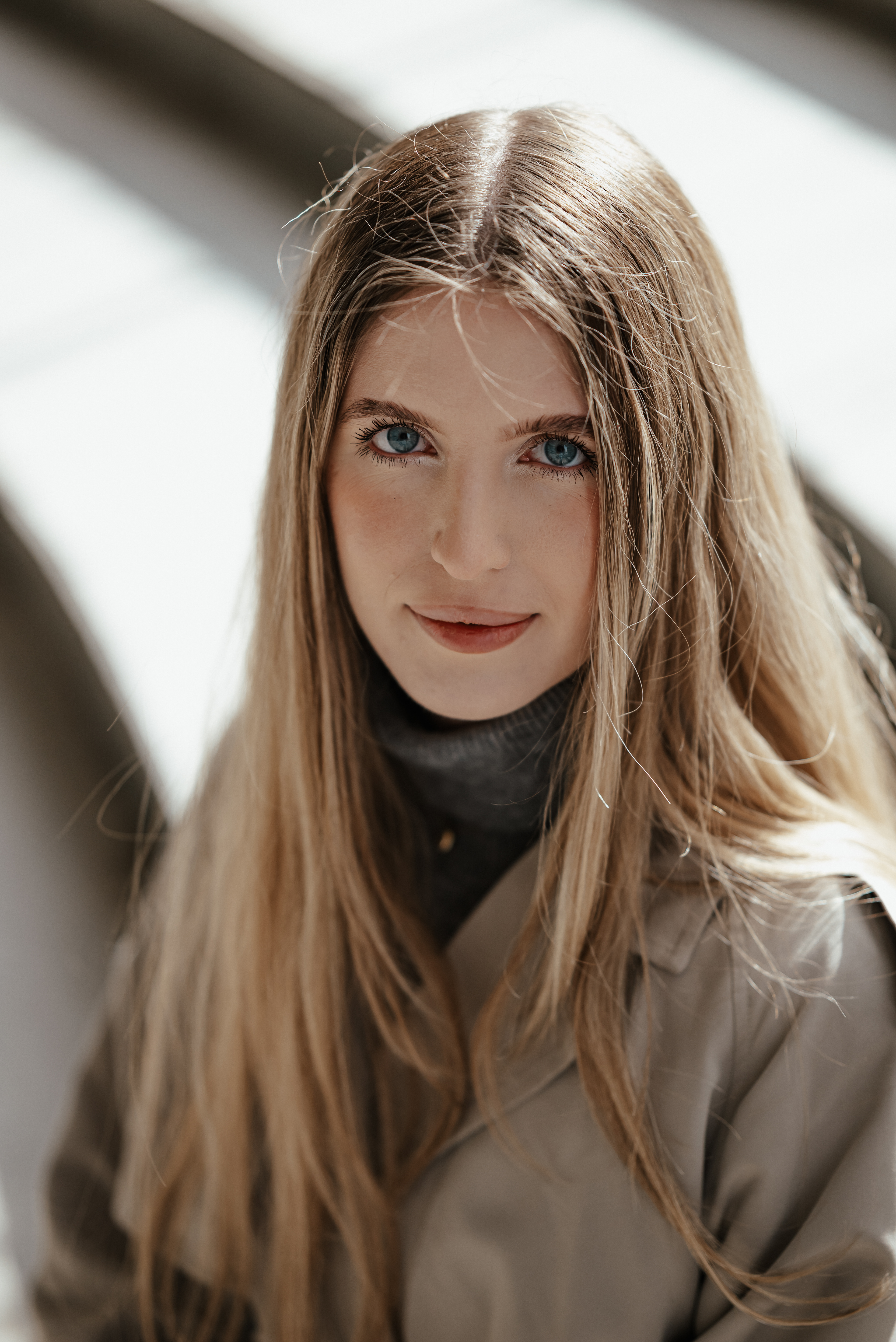 Monika ma w sobie spokój. Delikatność, która nie potrzebuje wielu słów. Wystarczyła chwila, byśmy złapały wspólny rytm. Zatrzymywałyśmy się tam, gdzie światło najpiękniej rysowało linię wokół niej – na schodach, w przejściu, przy barierkach.